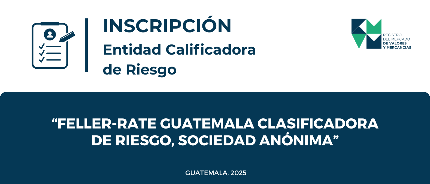 La entidad FELLER-RATE GUATEMALA CLASIFICADORA DE RIESGO, SOCIEDAD ANÓNIMA, hace del conocimiento del público en general que, el Registro del Mercado de Valores y Mercancías, en cumplimiento del Artículo 16, literal ñ) del Decreto número 34-96 del Congreso de la República de Guatemala, Ley del Mercado de Valores y Mercancías, con base en lo solicitado por esta entidad, y cumplidos los requisitos legales, resolvió mediante Resolución número RMVM-1188/2025 de fecha miércoles, 3 de diciembre de 2025, la cual en su parte conducente establece: “(…) V. Inscribir en el Sistema de Automatización Registral a la entidad FELLER-RATE GUATEMALA CLASIFICADORA DE RIESGO, SOCIEDAD ANÓNIMA como Entidad Calificadora de Riesgo (…)”.