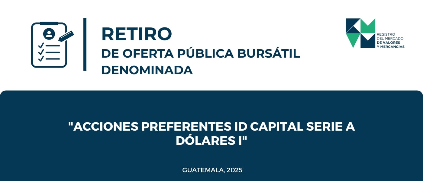 El Registro del Mercado de Valores y Mercancías informa al público en general que, con base a lo solicitado y cumplidos los requisitos legales establecidos en la Ley del Mercado de Valores y Mercancías, resolvió mediante resolución número RMVM-1162-2025 con fecha martes, 18 de noviembre de 2025, la cancelación del contrato de la oferta pública bursátil denominada “ACCIONES PREFERENTES ID CAPITAL SERIE A DÓLARES I”, presentada por la entidad denominada ID CAPITAL WORLDWIDE, SOCIEDAD ANÓNIMA(…)