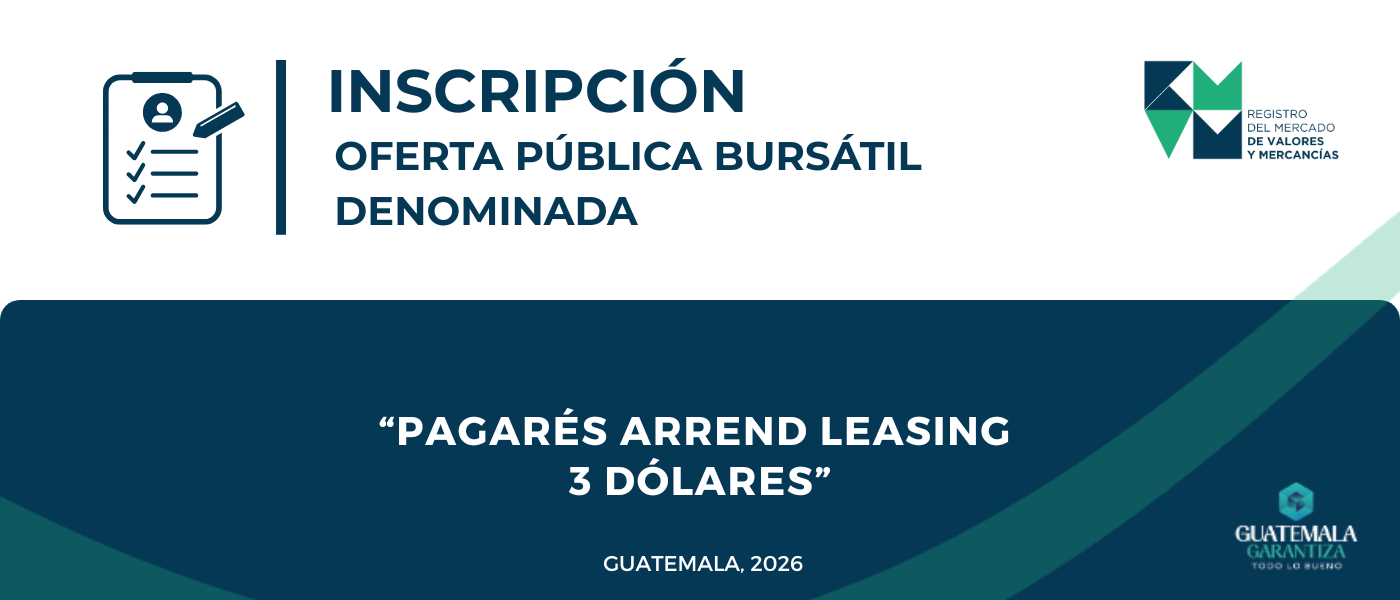 El Registro del Mercado de Valores y Mercancías informa al público en general que, con base a lo solicitado y cumplidos los requisitos legales establecidos en la Ley del Mercado de Valores y Mercancías, resolvió mediante resolución número RMVM-1271-2025 con fecha martes, 30 de diciembre de 2025, la inscripción de la oferta pública bursátil denominada “PAGARÉS ARREND LEASING 3 DÓLARES”, presentada por la entidad denominada ARREND LEASING, SOCIEDAD ANÓNIMA.