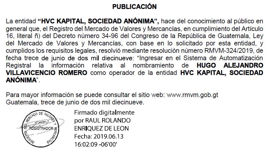 | 13/06/2021 | HVC KAPITAL, S.A.- Inscripción de Agente de Valores | Ver Imagen |