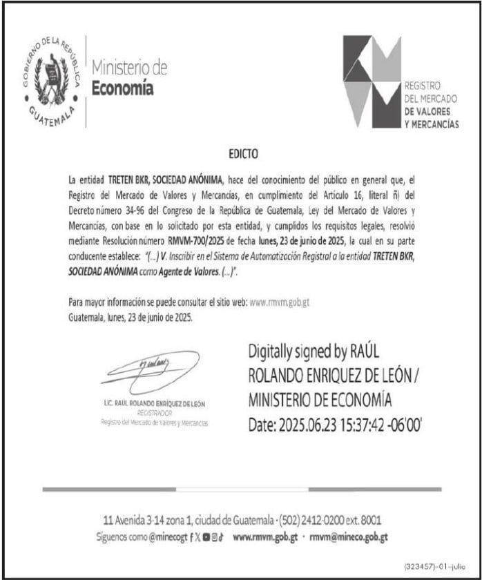 | 1/07/2024 | TRETEN BKR, S.A. INSCRIPCIÓN AGENTE DE VALORES | Ver Imagen |