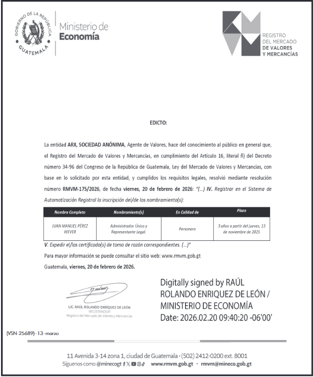 | 13/03/2026 | ARX, S.A. INSCRIPCIÓN PERSONERO | Ver Imagen |