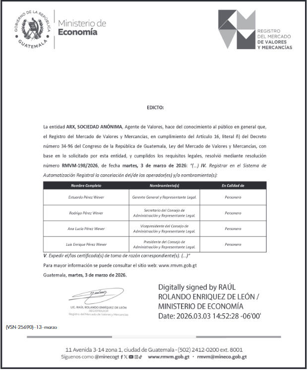 | 13/03/2026 | ARX, S.A. CANCELACIÓN DE PERSONEROS | Ver Imagen |