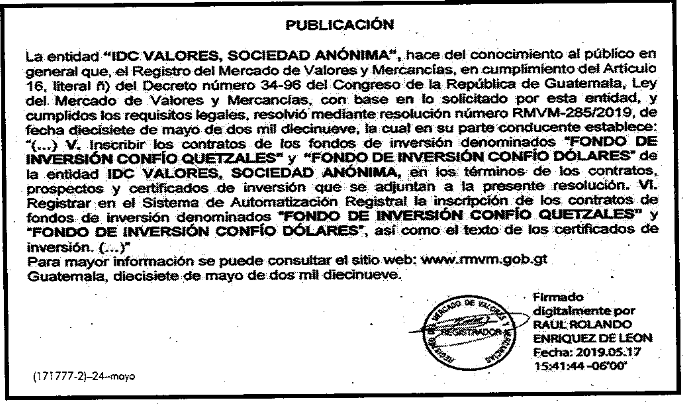 | 24/05/2019 | IDC VALORES, S.A.- Inscripción de contratos de fondo de inversión | Ver Imagen |