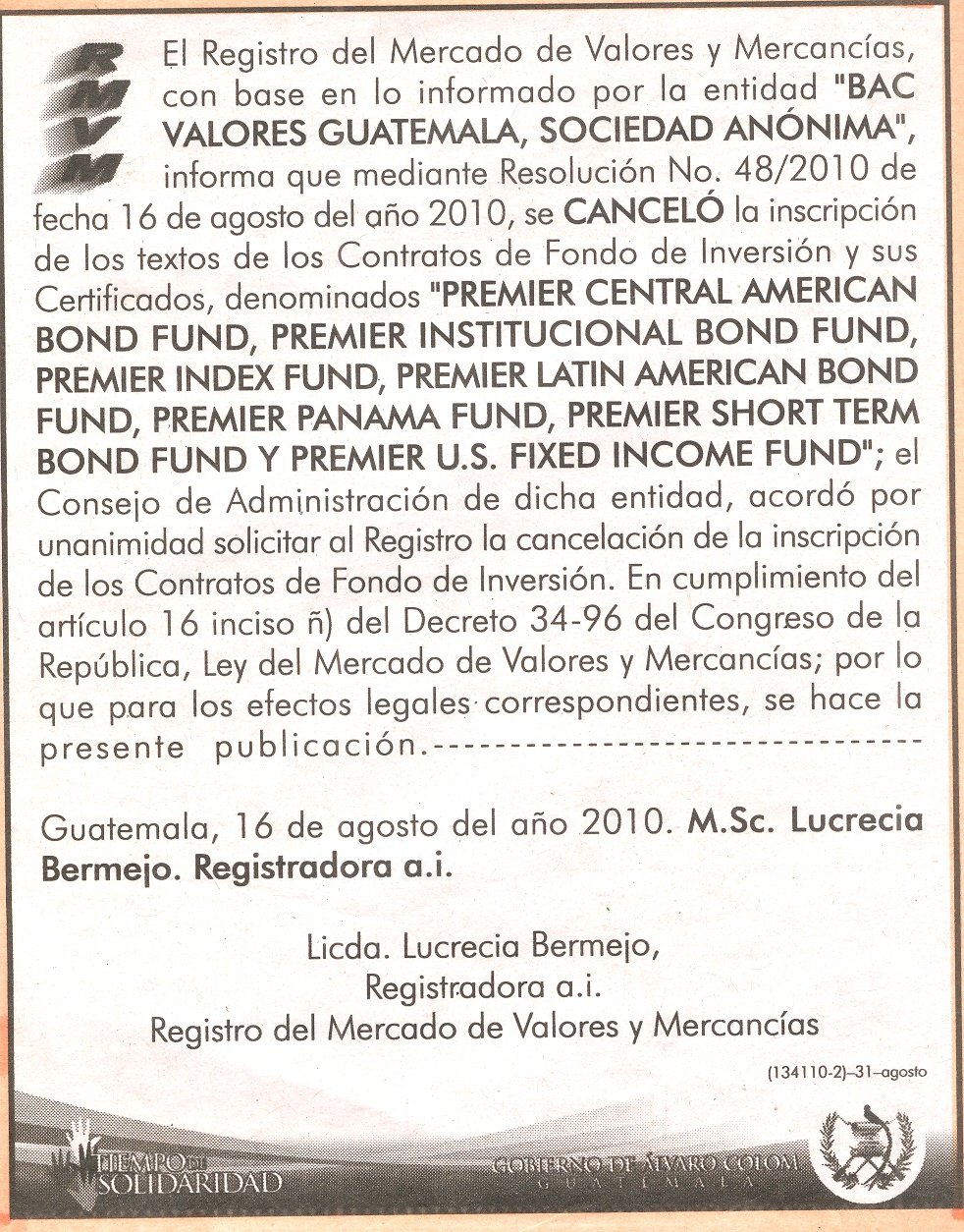 | 07/09/2010 | BAC VALORES GUATEMALA, S.A.- Cancelación de contratos de fondo de inversión | Ver Imagen |