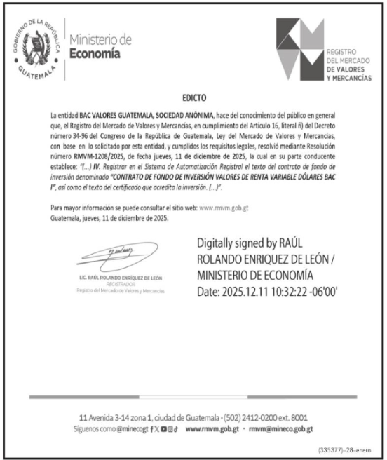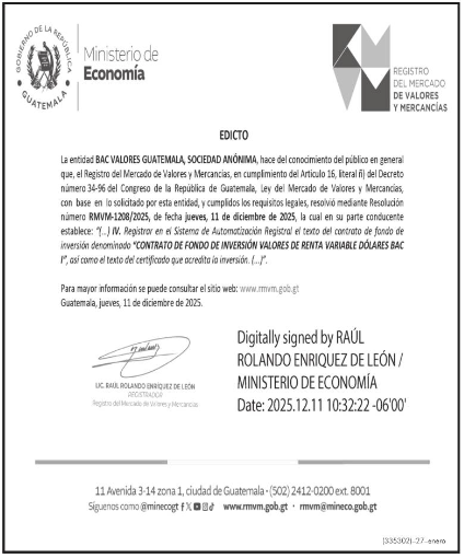 | 03/02/2022 | BAC VALORES GUATEMALA, S.A.- Inscripción de contrato de fondo de inversión | Ver Imagen |
