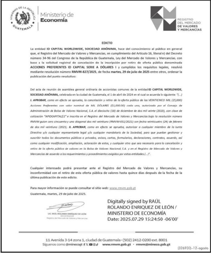 12/08/2025 ID CAPITAL WORLDWIDE, S.A. RETIRO DE OFERTA PÚBLICA Ver Imagen