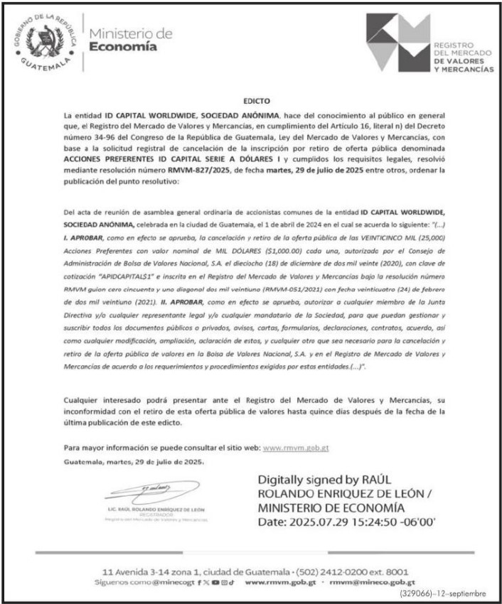 12/09/2025 ID CAPITAL WORLDWIDE, S.A. RETIRO DE OFERTA PÚBLICA Ver Imagen