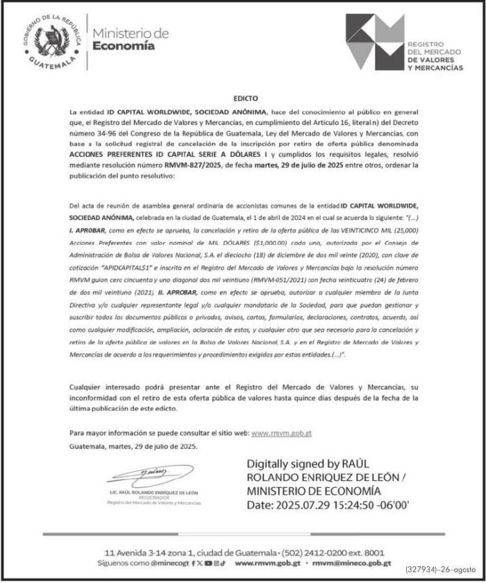 26/08/2025 ID CAPITAL WORLDWIDE, S.A. RETIRO DE OFERTA PÚBLICA Ver Imagen