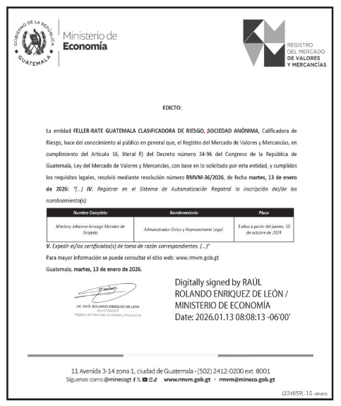 | 15/01/2026 | FELLER-RATE GUATEMALA CLASIFICADORA DE RIESGO, SOCIEDAD ANÓNIMA | Ver Imagen |
