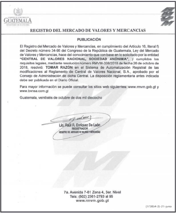 21/06/2019 Modificaciones al Reglamento de Central de Valores Nacional, S.A. Ver Imagen